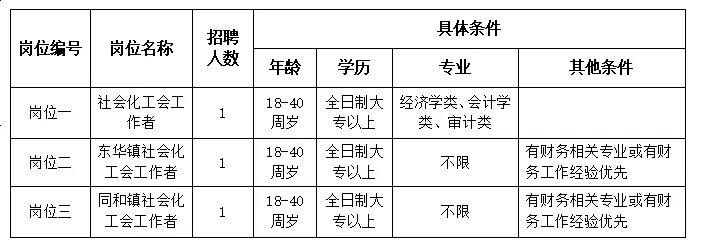 (五)具有全日制大專以上文化程度,年齡18-40周歲,性別不限;崗位一專業(yè)必須為經(jīng)濟(jì)學(xué)類、會計(jì)學(xué)類、審計(jì)類專業(yè);崗位二、崗位三專業(yè)不限,同等條件下,有財(cái)務(wù)相關(guān)專業(yè)或有財(cái)務(wù)工作經(jīng)驗(yàn)優(yōu)先;