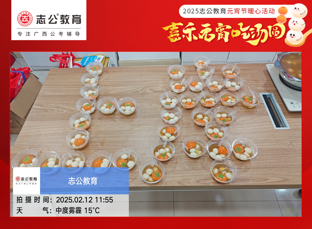 元宵節(jié),作為中國(guó)的傳統(tǒng)節(jié)日之一,承載著團(tuán)圓、歡樂(lè)與美好的祈愿。在這個(gè)溫馨的佳節(jié),志公教育也為正在備考的學(xué)員以及公司員工都送上了一份甜蜜驚喜 —— 暖心湯圓,讓每一位小伙伴/學(xué)員都能在忙碌的學(xué)業(yè)/工作之余,感受到濃濃的節(jié)日氛圍與志公教育關(guān)懷。