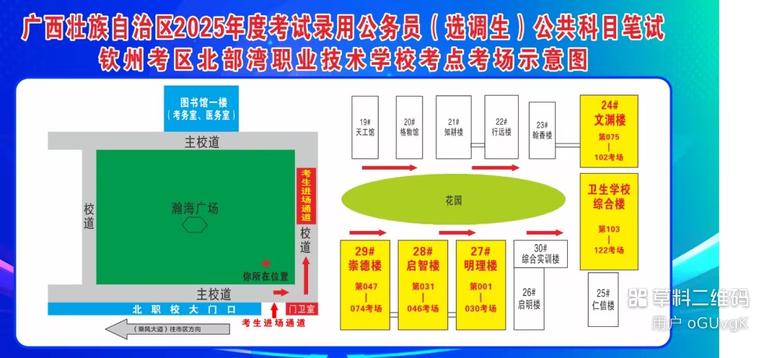 欽州考區(qū)共設兩個考點,分別為北部灣大學考點、北部灣職業(yè)技術(shù)學??键c。(考點地址和具體考場安排請掃附后的二維碼查看)
