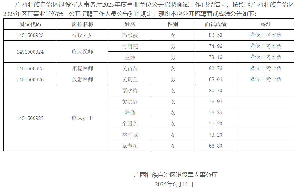 廣西壯族自治區(qū)退役軍人事務(wù)廳關(guān)于發(fā)布2025年度事業(yè)單位公開招聘面試成績(jī)的公告