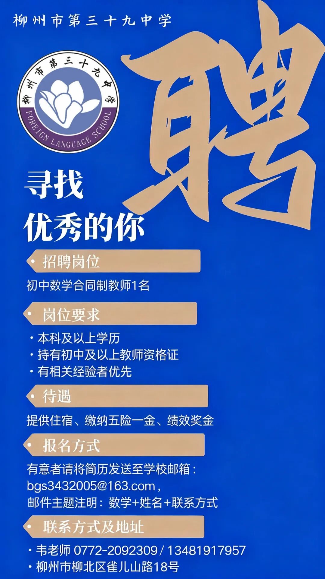 2025年柳州市第三十九中學招聘初中數(shù)學合同制教師1名