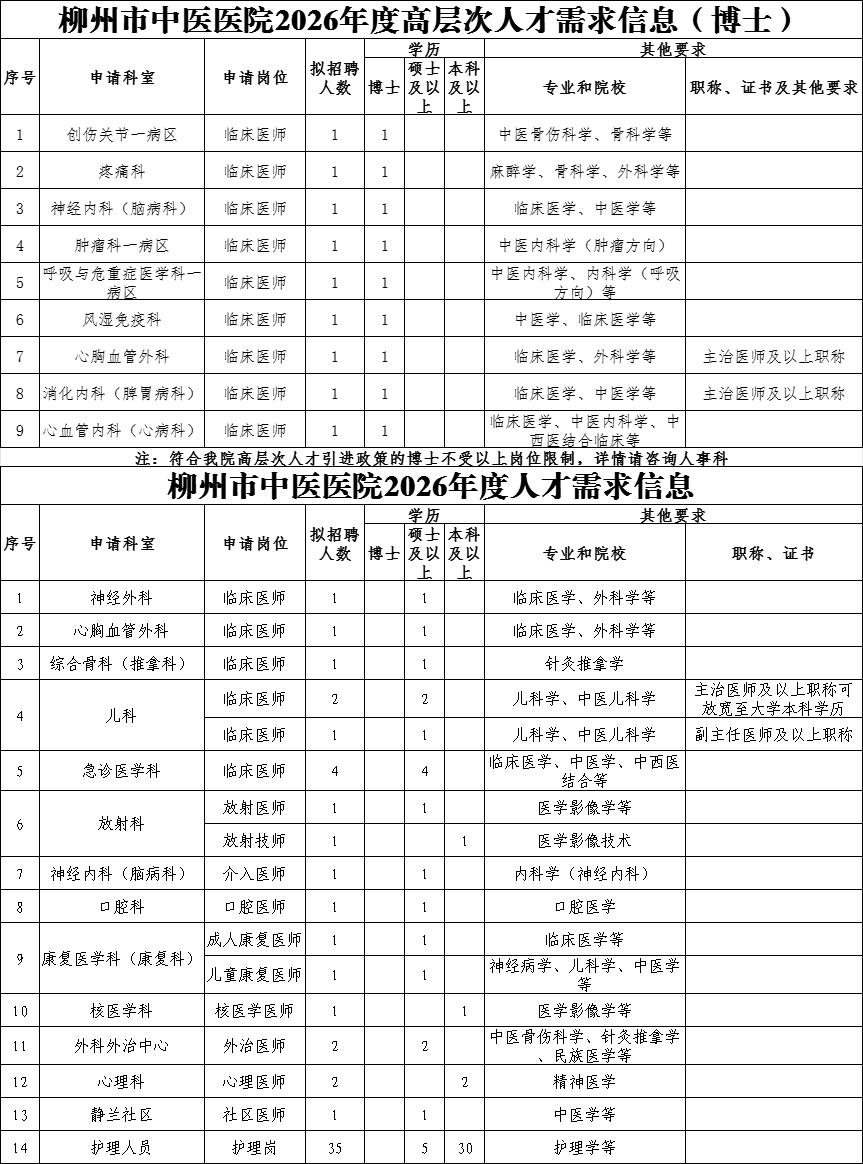 高層次人才不受招聘崗位限制,均可一事一議、一人一議。高層次人才(博士)根據(jù)醫(yī)院引進(jìn)人才制度,給予25萬(wàn)-120萬(wàn)元安家費(fèi)、5萬(wàn)-20萬(wàn)元科研啟動(dòng)經(jīng)費(fèi)。引進(jìn)的高層次人才(高級(jí)職稱(chēng)或博士研究生)按柳州市有關(guān)政策提供事業(yè)編制,協(xié)助其解決子女入學(xué)和配偶工作。2026年醫(yī)學(xué)類(lèi)緊缺人才擬招聘醫(yī)師7人,緊缺人才科室為心理科(精神衛(wèi)生專(zhuān)業(yè))、神經(jīng)外科、急診醫(yī)學(xué)科,擬享受柳州市中醫(yī)醫(yī)院人才引進(jìn)醫(yī)學(xué)類(lèi)緊缺人才安家費(fèi)2-20萬(wàn)元,同時(shí)按照國(guó)家、廣西壯族自治區(qū)、柳州市及醫(yī)院有關(guān)政策享受工資及福利待遇,獎(jiǎng)勵(lì)性績(jī)效工資按照醫(yī)院同級(jí)同類(lèi)人員規(guī)定執(zhí)行。如為學(xué)科帶頭人或高層次人才則另按其標(biāo)準(zhǔn)享受相關(guān)待遇。