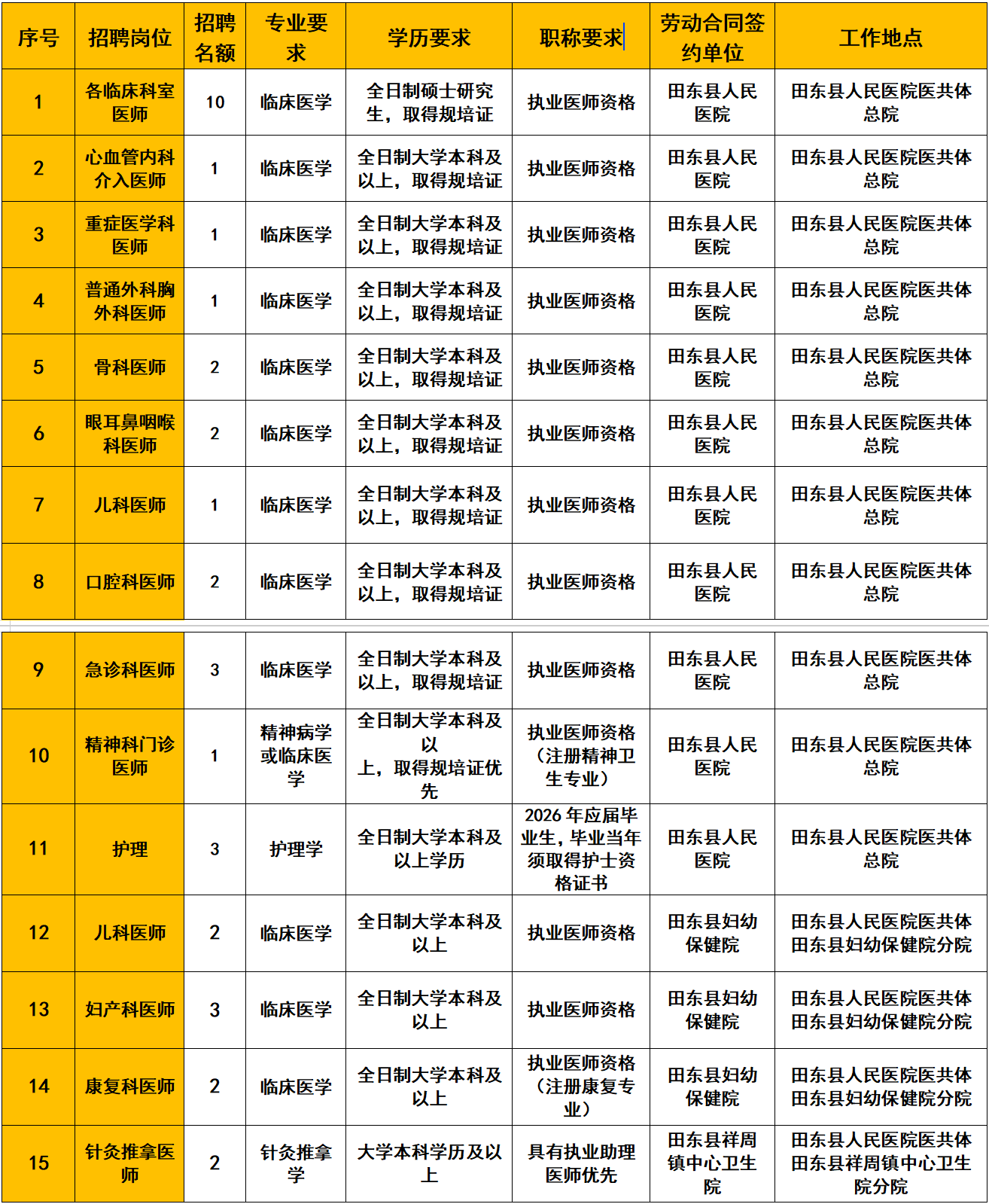 本次招聘是田東縣人民醫(yī)院醫(yī)共體總院根據(jù)總院、各分院的人才需求情況統(tǒng)一招聘,被錄用人員根據(jù)具體工作地點(diǎn)與相應(yīng)分院或總院簽訂勞動(dòng)合同,被錄取人員的薪酬、福利待遇由相應(yīng)的分院或總院按同類(lèi)型人員發(fā)放。具體招聘崗位詳見(jiàn)附件:《2026年田東縣人民醫(yī)院醫(yī)共體
