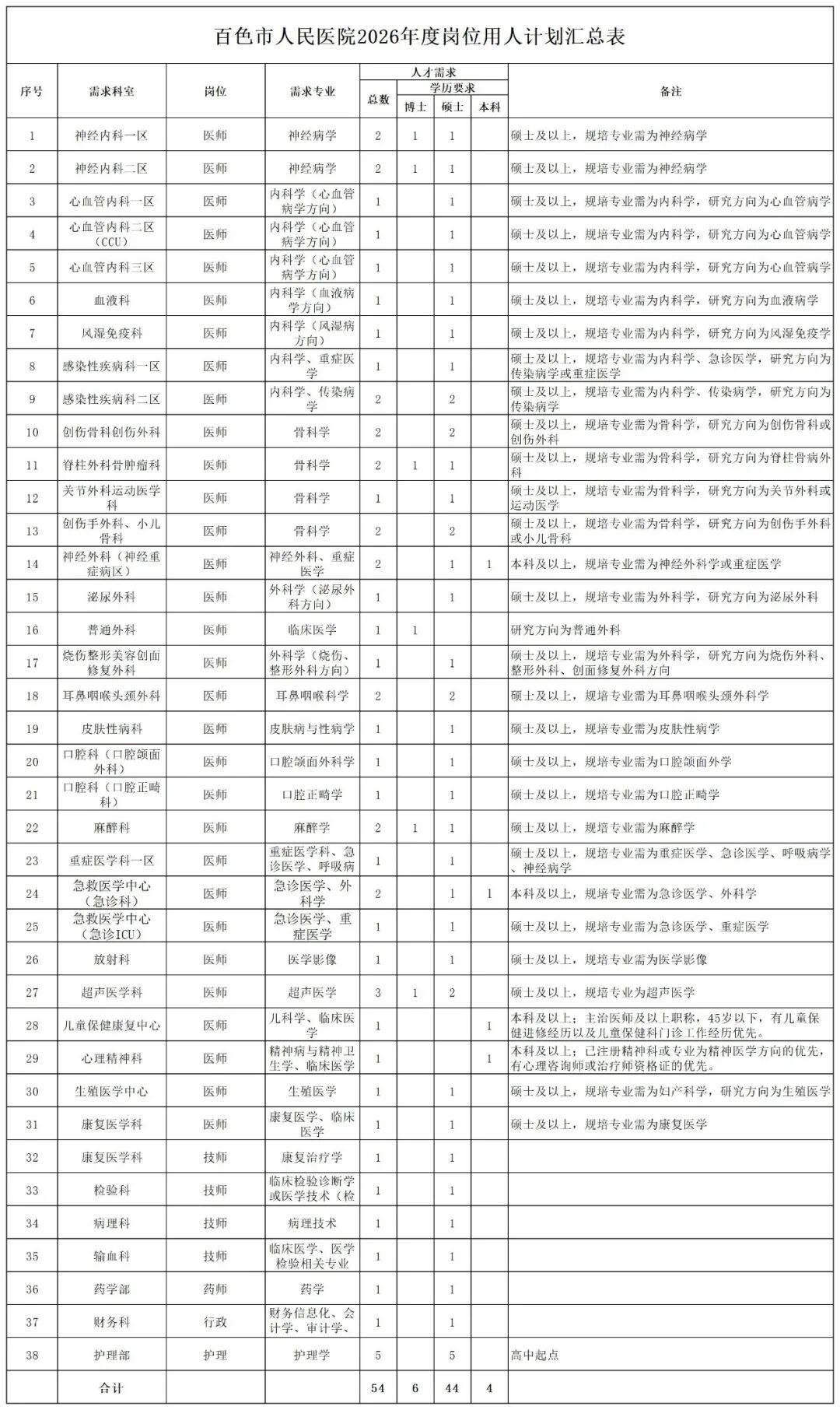 為進(jìn)一步加強(qiáng)醫(yī)院人才隊(duì)伍建設(shè),提升醫(yī)療服務(wù)能力,百色市人民醫(yī)院現(xiàn)面向社會(huì)公開招聘醫(yī)師、醫(yī)技及護(hù)理等崗位專業(yè)技術(shù)人才54人,具體如下: