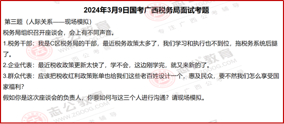 2??實務場景的解決能力座談會模擬題中,干部、企業(yè)、群眾的訴求各有不同:干部需要 “學習減負的方法”,企業(yè)需要 “政策傳遞的高效渠道”,群眾需要 “紅利賬單的普及”,考生的回應不能只說 “我會解決”,而要給出稅務工作中實際可用的辦法(比如給干部開 “政策精簡小課堂”,給企業(yè)推 “政策精準推送系統(tǒng)”)。
